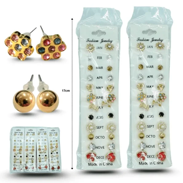 A – 008 arete surtido en planilla arracada con dos broqueles set 3 pzas C/12 25F-58 $78.00 Costo por paquete